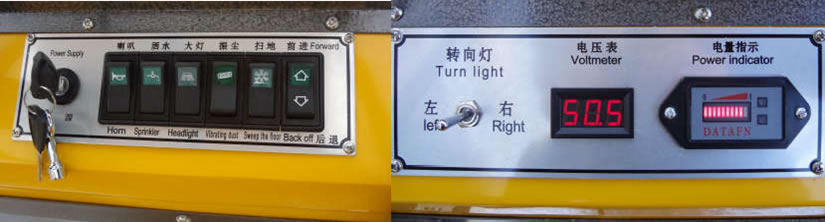 1、中英文儀表臺 2、電壓表、電量表、轉向燈 3、邊刷防裝裝置 4、后視鏡